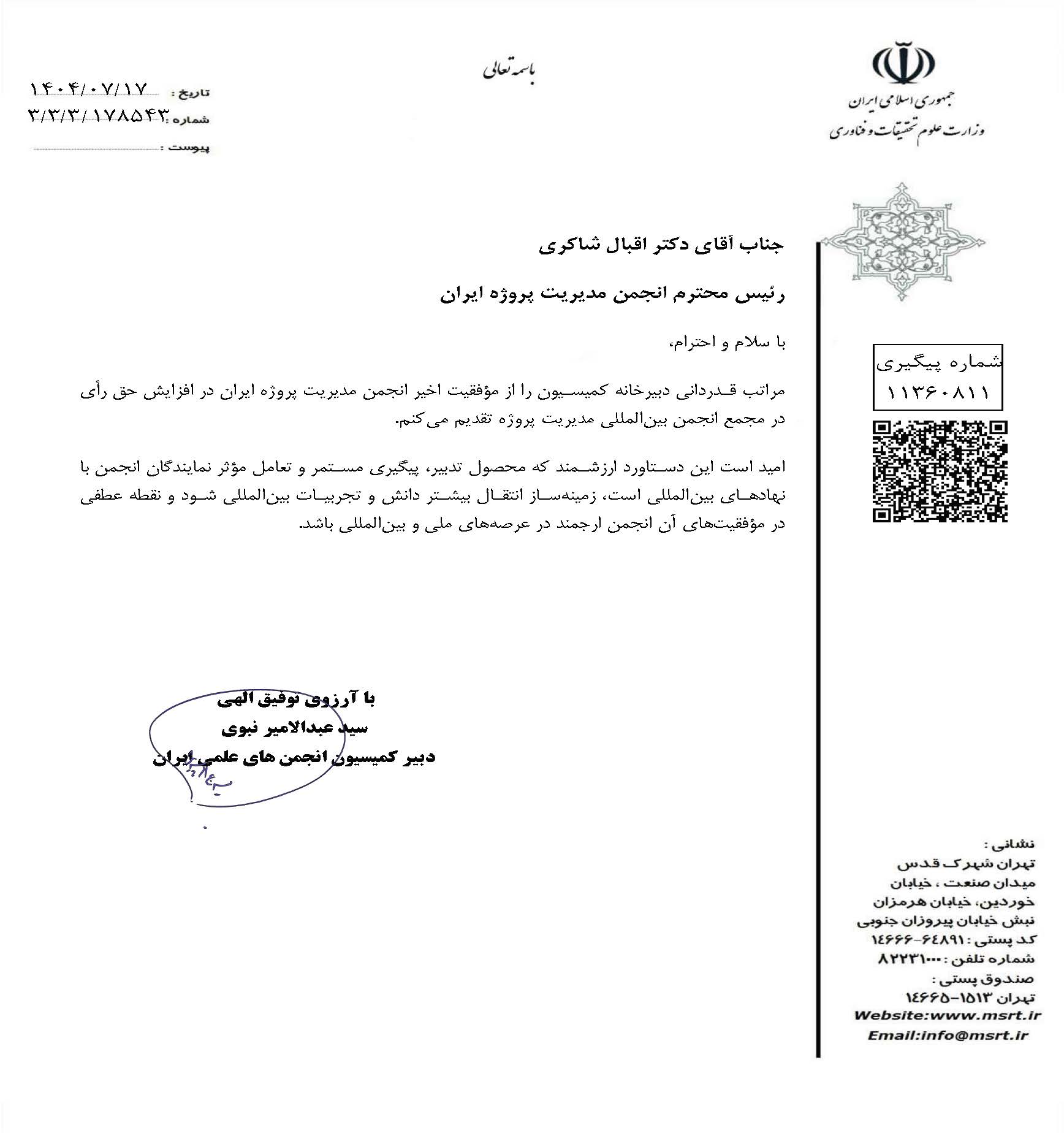 قدردانی دبیر کمیسیون انجمن های علمی بمنظور کسب ارتقا حق رأی انجمن در مجمع بین المللی
