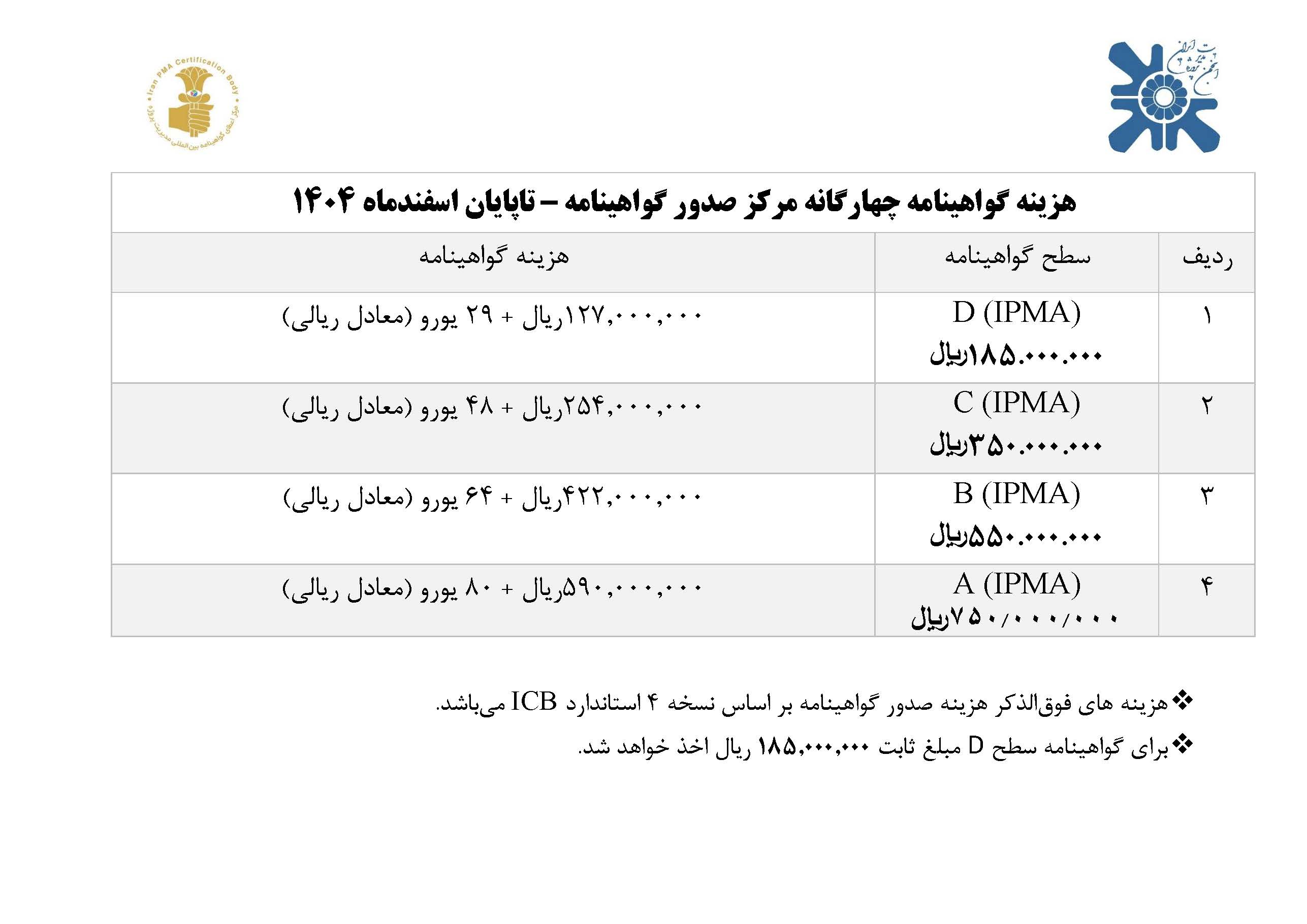 هزینه گواهینامه چهارگانه مرکز صدور گواهینامه – تاپایان اسفندماه 1404